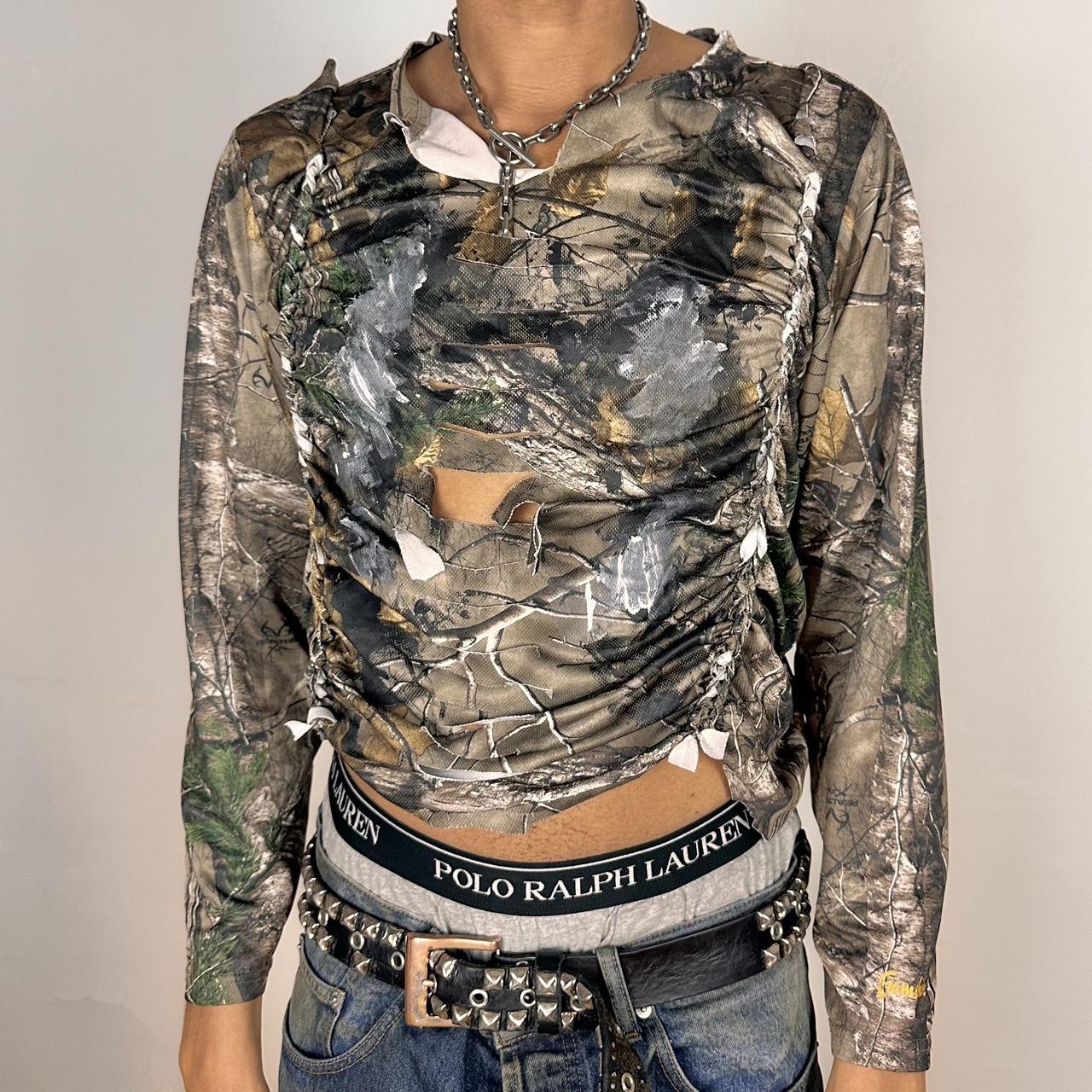 Where rugged meets reconstructed. This one-of-a-kind ASTROBOI* piece takes a vintage Real Tree camo long sleeve and transforms it with braids running down the sides and spine, plus raw slashes at the chest for a rebellious edge. A sliced V neckline adds shape, while black and white paint splashes across the front bring signature ASTROBOI* grit.