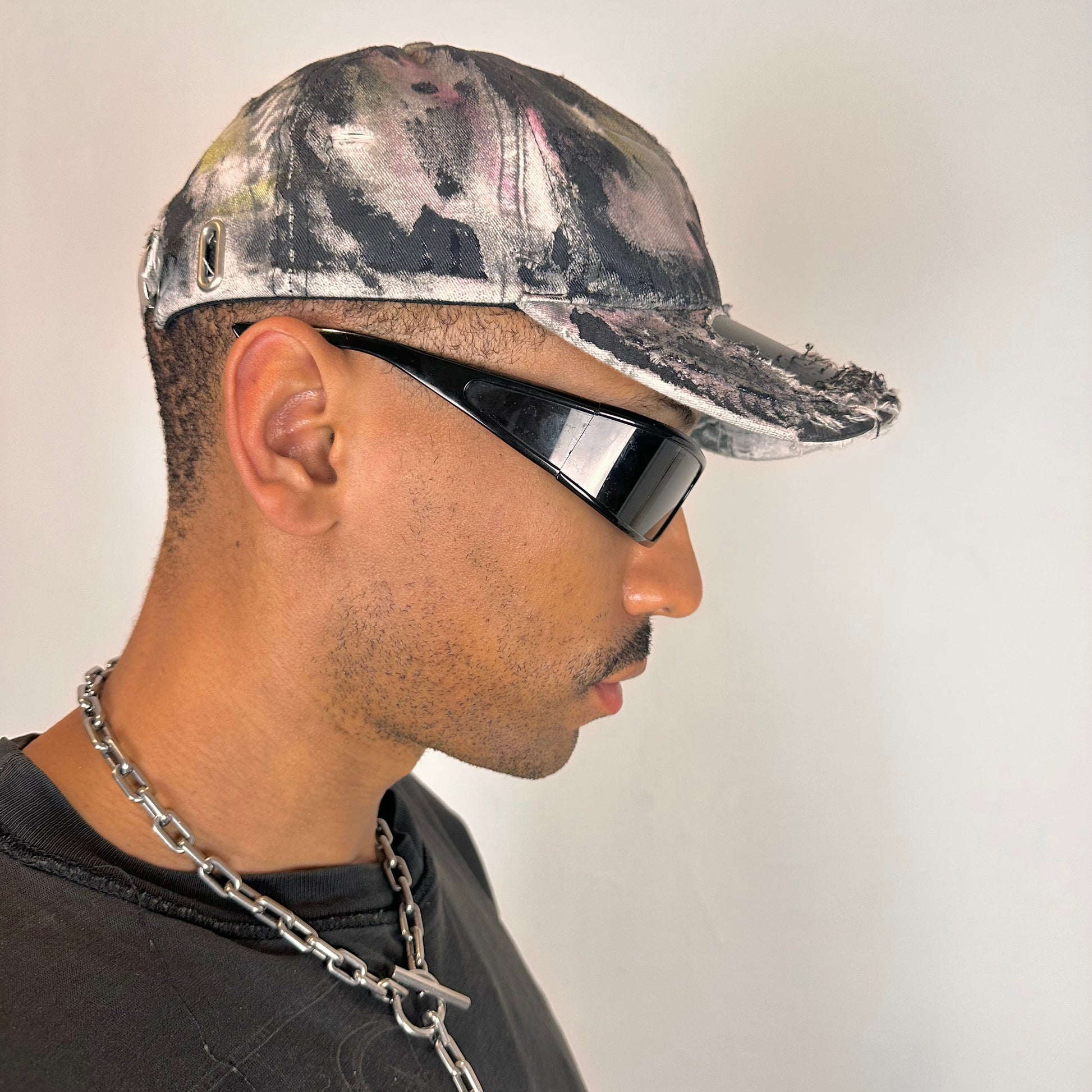 ASTROBOI* Y2K Trompe L'oeil Hat is designed to mimic the texture of white and black denim, this one-of-a-kind piece fuses streetwear edge with Y2K-era illusion. Featuring distressed detailing, black paint shading, and clear resin embellishment, the deconstructed visor adds dimensional grit and character.